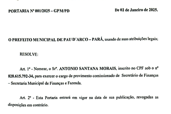 Após os festejos de final de ano e no acender das luzes de 2025, o primeiro ato do Sr. Domingos Guedes Neto (mais conhecido como Domingos Enfermeiro) ao se levantar da cama foi entregar as chaves do cofre da cidade ao Toni Morais como o novo e poderoso Secretário de Finanças e Fazenda, através da Portaria nº 001/2025 no dia 02 de janeiro.